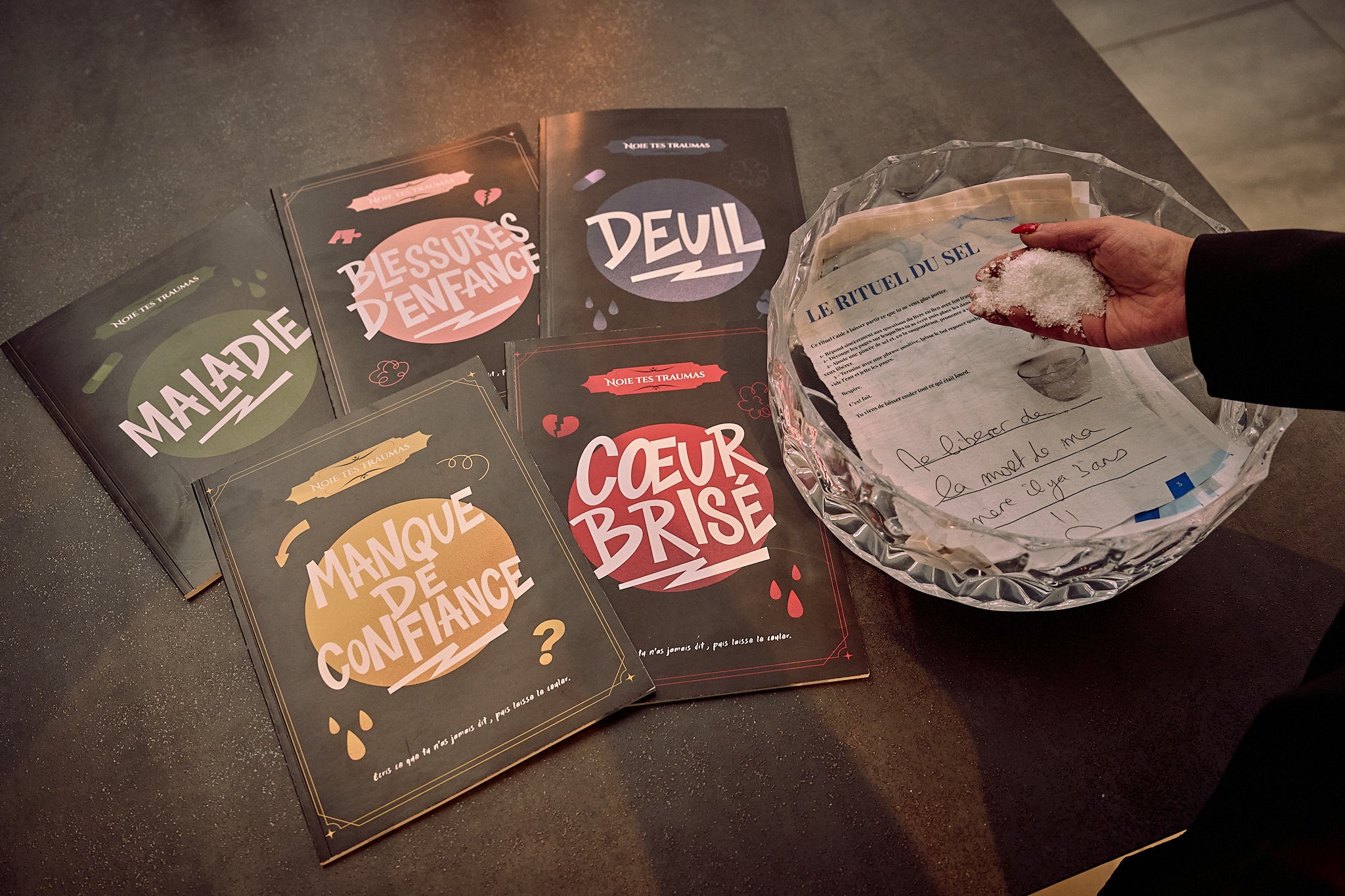 Un rituel final est proposé : symboliquement noyer ses réponses dans un bol d’eau salée.